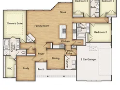 The 4-bedroom Colorado 2 presents a creative yet sensible layout of the home’s 2,417 square feet of living space. Right from the front entrance, you can see the entire main living area. This open concept enhances the spacious feeling and makes it easy to have conversations no matter where you are—perfect for entertaining! The kitchen is a definite eye-catcher in the Colorado 2. We’ve incorporated a massive center island that doubles your counter space and provides comfortable seating for 4 people at the breakfast bar. You can also enjoy the view of the fireplace in the family room. If a formal dining room is on your new home wish list, check that off. Just a few steps from the kitchen, this floor plan has just the room for those special occasions. If formal isn’t your thing, use this as a playroom or a living room. Across the foyer, the Colorado 2 also gives you a flex room to expand on the versatility. With a few small adjustments, you could convert it to a fifth bedroom. The design of the owner's suite is one of the (many) reasons people love this floor plan. The bedroom is nestled in the back of the home under a tray ceiling that accentuates the roominess. The Colorado 2 smartly uses space in the bathroom for both a soaking tub and step-in shower, along with dual vanities and a private water closet. Then your suite is completed with an expansive walk-in closet with wooden shelves and racks ready and waiting for your wardrobe. The 3 secondary bedrooms are cluste...