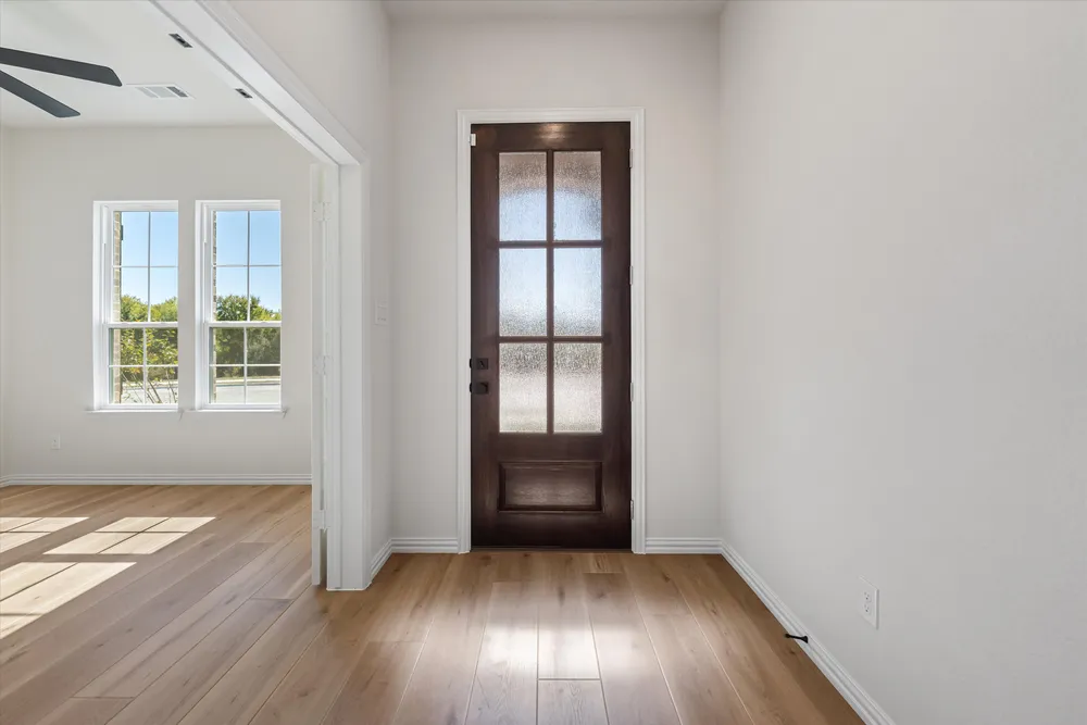 At Riverside Homebuilders, we pride ourselves in providing unique homes with floor plans that are as individual as our customers. This 3-bedroom, 2-bathroom home has a galley feel with an open floor plan. Walking into the grand foyer you’ll find yourself right at the entrance of the kitchen being welcomed by scents of freshly-baked cookies or a mouthwatering meal being prepared. The flex room in the front of the home can be easily utilized as another bedroom if needed or a den for reading and relaxing. Through the kitchen, you’ll find the cabinets open to the dining and living rooms at the heart of the home. A corner pantry gives you plenty of storage for snacks, canned goods, small appliances, and planning for a rainy day. To the right of the dining room lies the 2-bedroom wing. Whether for kids or guests, these rooms offer plenty of space with the convenience of their own full bathroom. Or, if you’re a new family preparing for your first little one, the secondary bedroom is close enough to the owner’s bedroom to feel safe having your baby sleep in their crib. The owner’s suite is nicely situated in the back corner with its own hallway to create the feel of your own private getaway. Enter the L-shaped bathroom through magnificent double doors. This floor plan offers one of our largest walk-in closets; we’ve maximized the space to offer enough room to change into that perfect outfit. Never track mud into your home again because the San Gabriel II has the laund...
