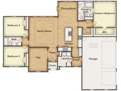 Inside, the 2,033-square-foot plan is designed with the busy family in mind. Keep all the main living concentrated in an open floor plan where walls don’t divide you. Whether you’re watching television in the large family room, entertaining in the dining room, or handling the kitchen duties, you can see everyone and everything. The kitchen’s center island functions like a hub. Sit down for a casual meal at the breakfast bar, sort the mail, catch up on the daily happenings, wash the dishes, or start prepping the next meal. Adjacent to the kitchen, you have the functional center of the home: mudroom and laundry. A hall bench and closet provide you with the organization you need to keep the clutter at bay. Your owner's suite is tucked away in the farthest corner of this single-level floor plan. Separated with a vestibule entrance, you have a private retreat. The owner's bath includes both a soaking tub and walk-in shower, plus dual vanities and a private water closet, so it’s very shareable. The other 2 secondary bedrooms of this split floor plan anchor the other side of the home where they share the second full bath. Both bedrooms are identically sized with plenty of space for anyone from a toddler to teen to another adult member of your household. The Cibolo also gives you the freedom of a flex room off the foyer. Convert it to the space you want to meet your needs.