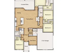 The Verbena floor plan features a modern, open-concept layout and the sought-after features today’s homeowners are searching for. With four bedrooms, three bathrooms, and a flex room, this plan boasts just over 2,400 square feet of functional living space. Upon entering the home off the front porch, you’re welcomed by an inviting foyer. Immediately to the left is a hallway with a bedroom, walk-in closet and full bathroom, as well as a linen closet. Across the foyer is a flex room, perfect for a home office, formal dining room or whatever need your family has for the space. Past the foyer is the family entry, with storage space and mud bench, which leads to the laundry room and two or three car attached garage. Through the entrance, the home opens up to a large family room with a stately fireplace. Adjacent to the family room is a gourmet kitchen, equipped with a walk-in pantry, ample counter space and an oversized island. Finishing off this open-concept living area is a dining space which overlooks the covered back patio. The remainder of this one-story floor plan is just off the living space. A hall leads to two bedrooms with walk-in closets, another linen closet and a shared full bathroom. The back corner of the home offers privacy for the owner’s suite, featuring a massive walk-in closet and bathroom with a dual-sink vanity, standalone soaking tub and glass-enclosed shower.