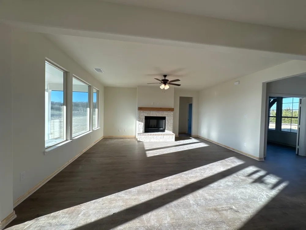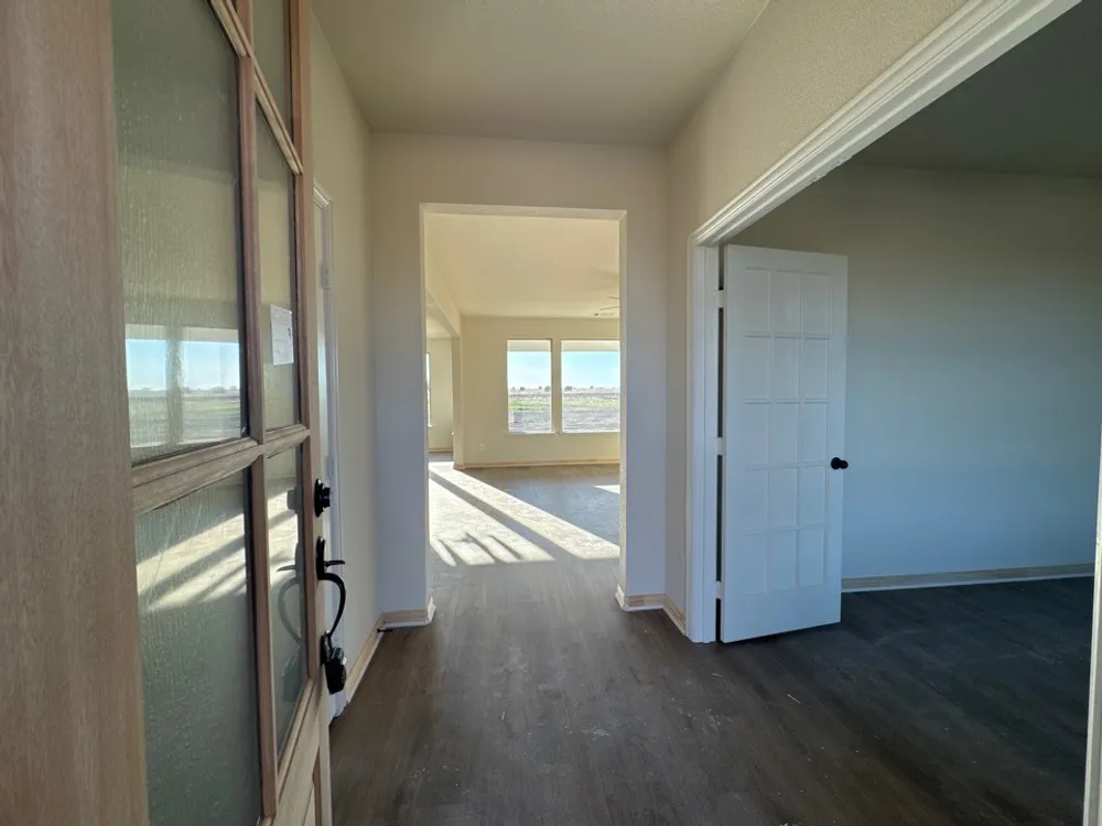 Inside, the 2,033-square-foot plan is designed with the busy family in mind. Keep all the main living concentrated in an open floor plan where walls don’t divide you. Whether you’re watching television in the large family room, entertaining in the dining room, or handling the kitchen duties, you can see everyone and everything. The kitchen’s center island functions like a hub. Sit down for a casual meal at the breakfast bar, sort the mail, catch up on the daily happenings, wash the dishes, or start prepping the next meal. Adjacent to the kitchen, you have the functional center of the home: mudroom and laundry. A hall bench and closet provide you with the organization you need to keep the clutter at bay. Your owner's suite is tucked away in the farthest corner of this single-level floor plan. Separated with a vestibule entrance, you have a private retreat. The owner's bath includes both a soaking tub and walk-in shower, plus dual vanities and a private water closet, so it’s very shareable. The other 2 secondary bedrooms of this split floor plan anchor the other side of the home where they share the second full bath. Both bedrooms are identically sized with plenty of space for anyone from a toddler to teen to another adult member of your household. The Cibolo also gives you the freedom of a flex room off the foyer. Convert it to the space you want to meet your needs.